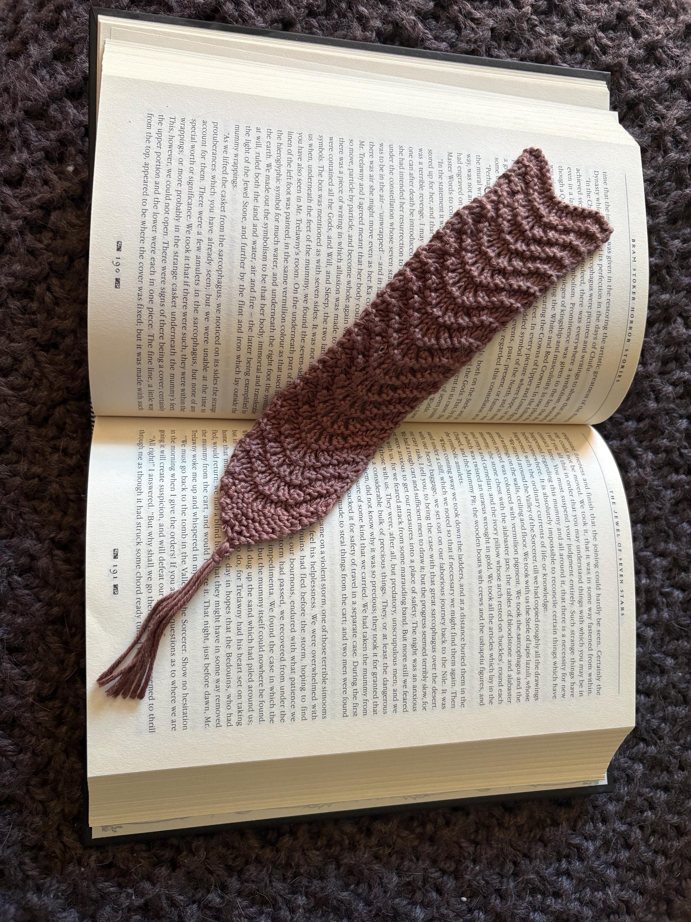 Hand knit feathered bookmark made to order. Approximately 7 inches in length, can be modified by request. Many different colors available! Soft texture with beautiful pattern, perfect gift for book lovers!